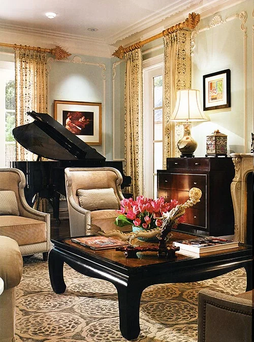 Drapery in Pasini Design "Prague Due" printed 100% Hemp, in Oceano and Champagne inks.