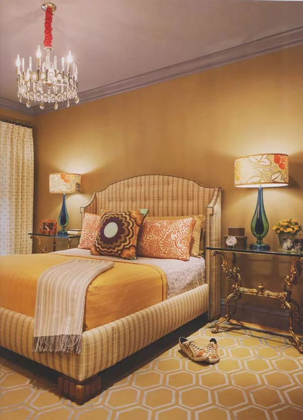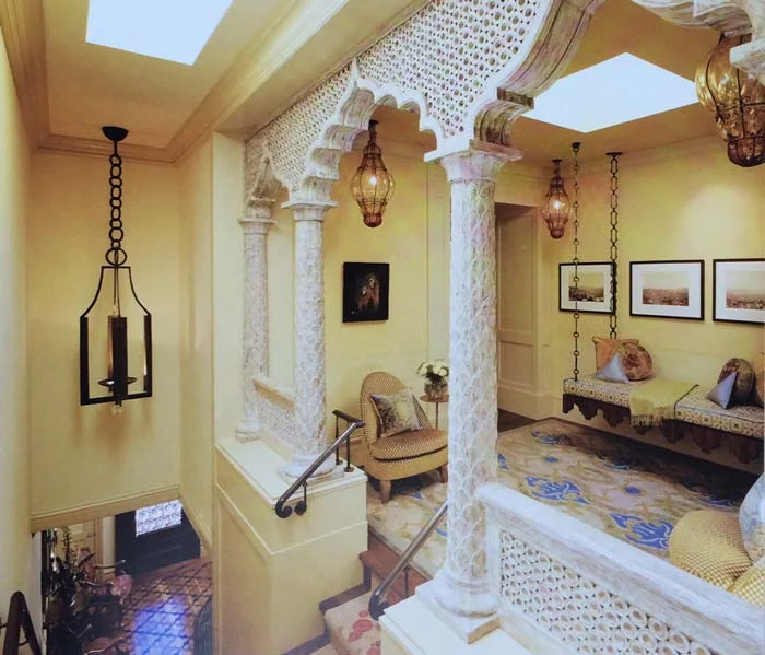 Swing upholstered in Pasini Design "Prague Uno" printed Canyon Faux Suede, in Oceano and Bronze inks. Triangle pillows covered in "Rosetta Screen" printed Shadow Faux Suede, in Borghese ink.